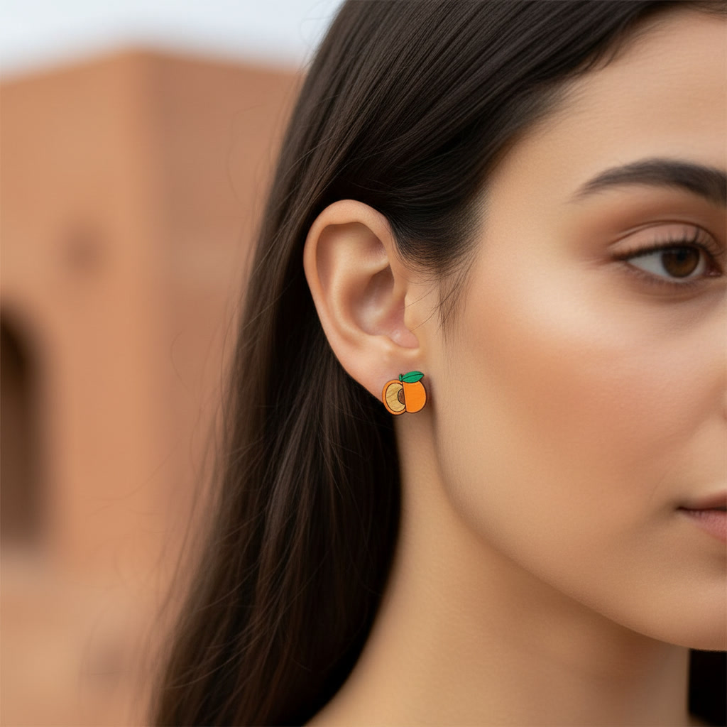 Chaque paire est soigneusement peinte à la main avec de l’acrylique, mêlant des tons orangés chauds et des nuances douces pour refléter la couleur vibrante et la texture veloutée de l’abricot. Une fine couche de résine est appliquée pour rehausser l’éclat naturel et la brillance de ces bijoux uniques, leur conférant une allure raffinée et captivante.
